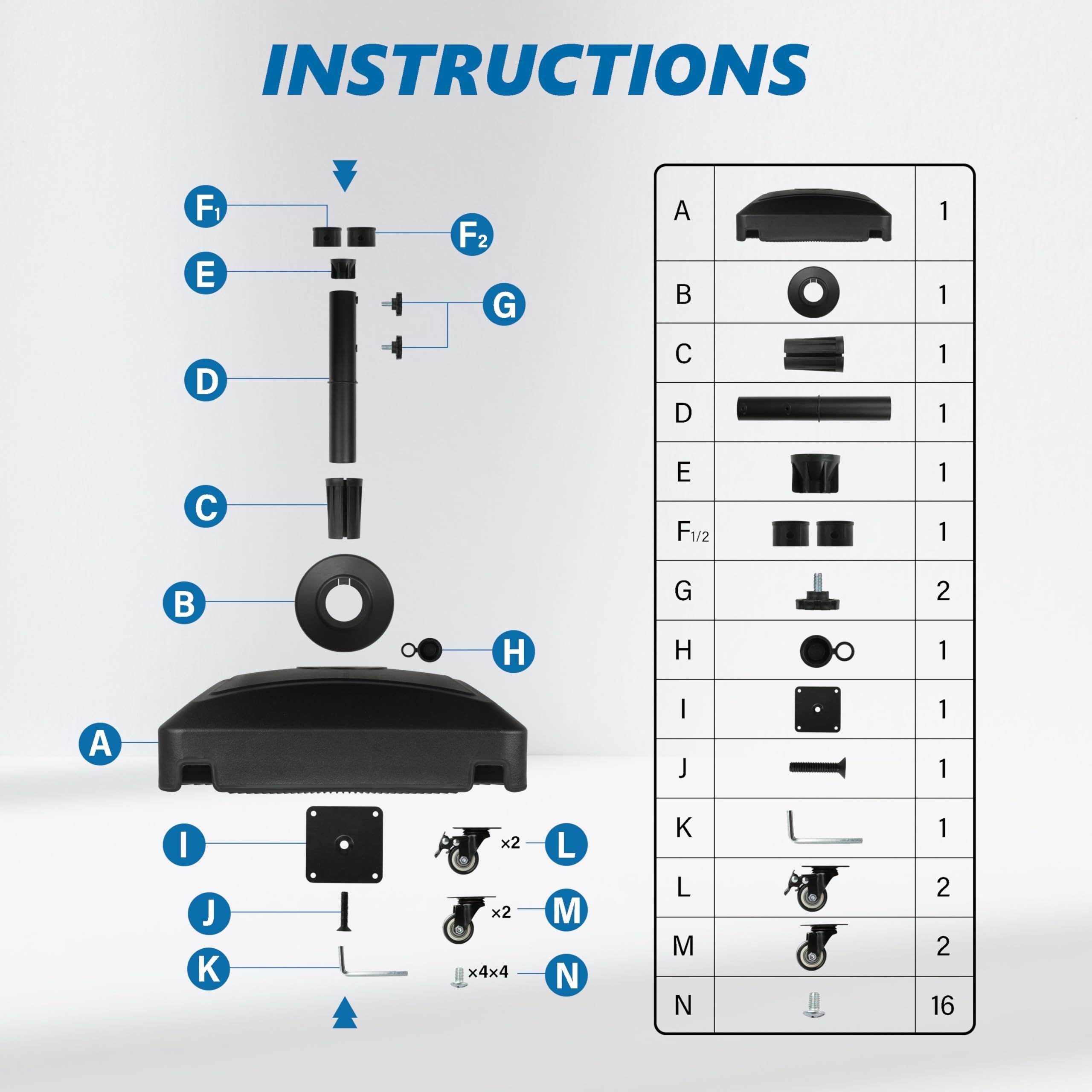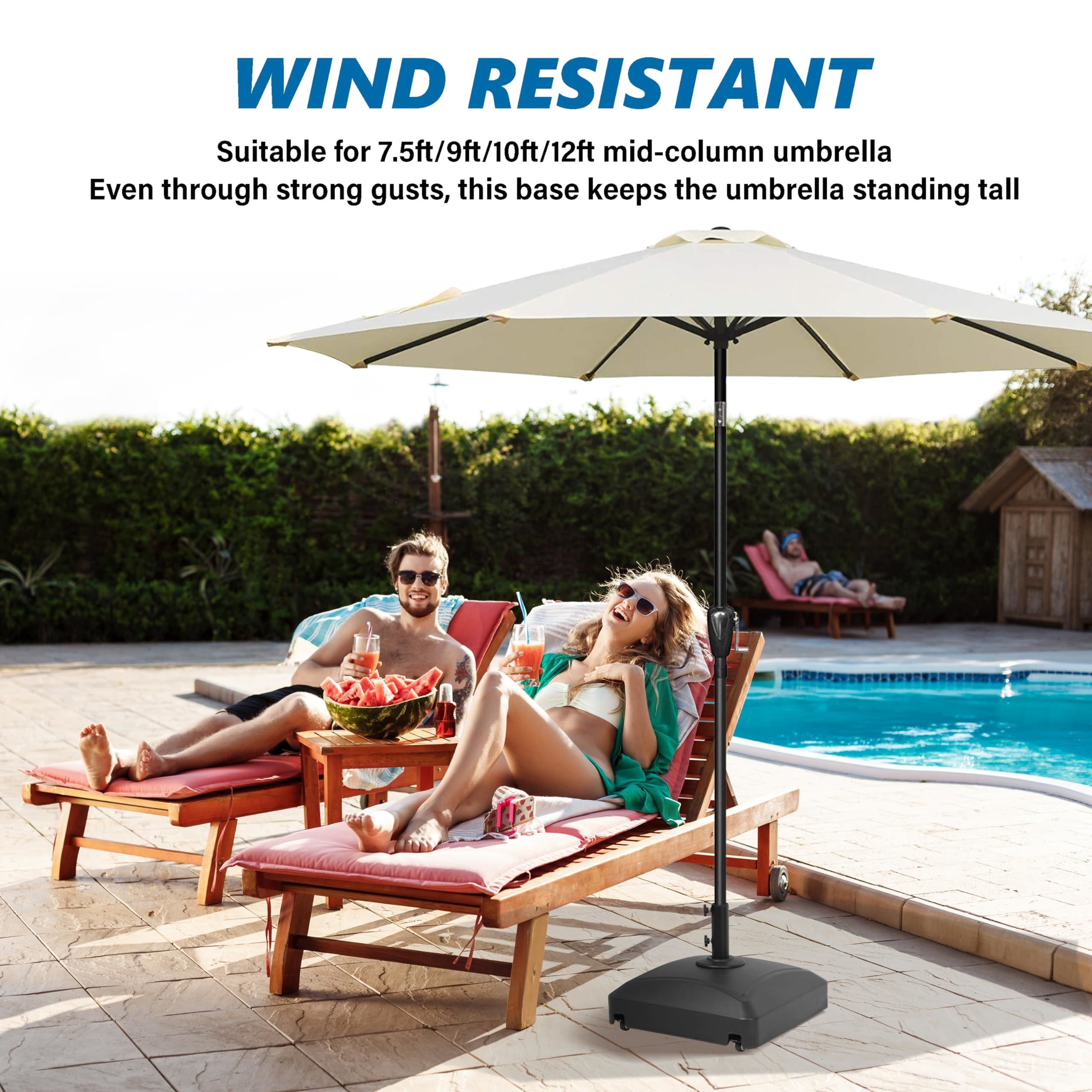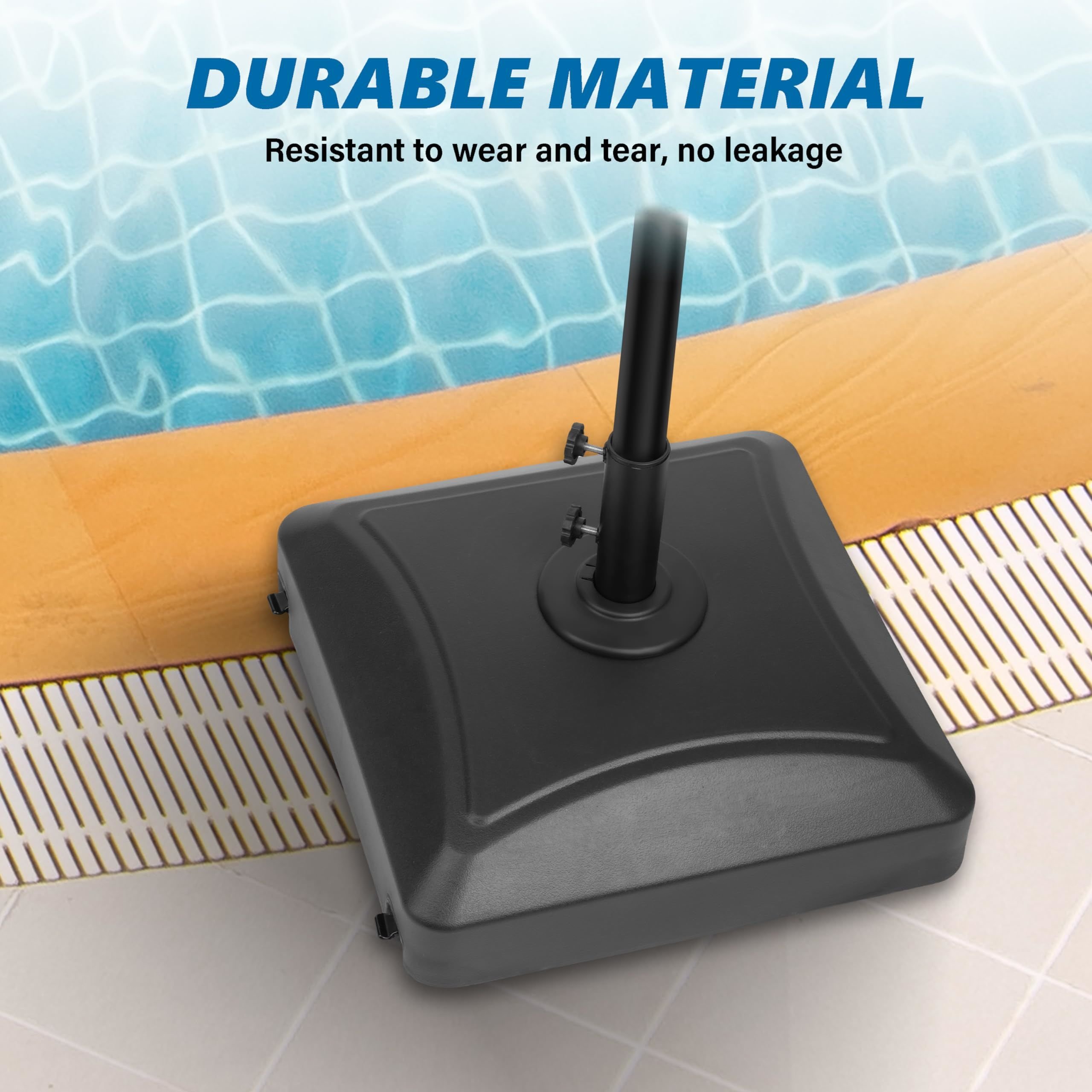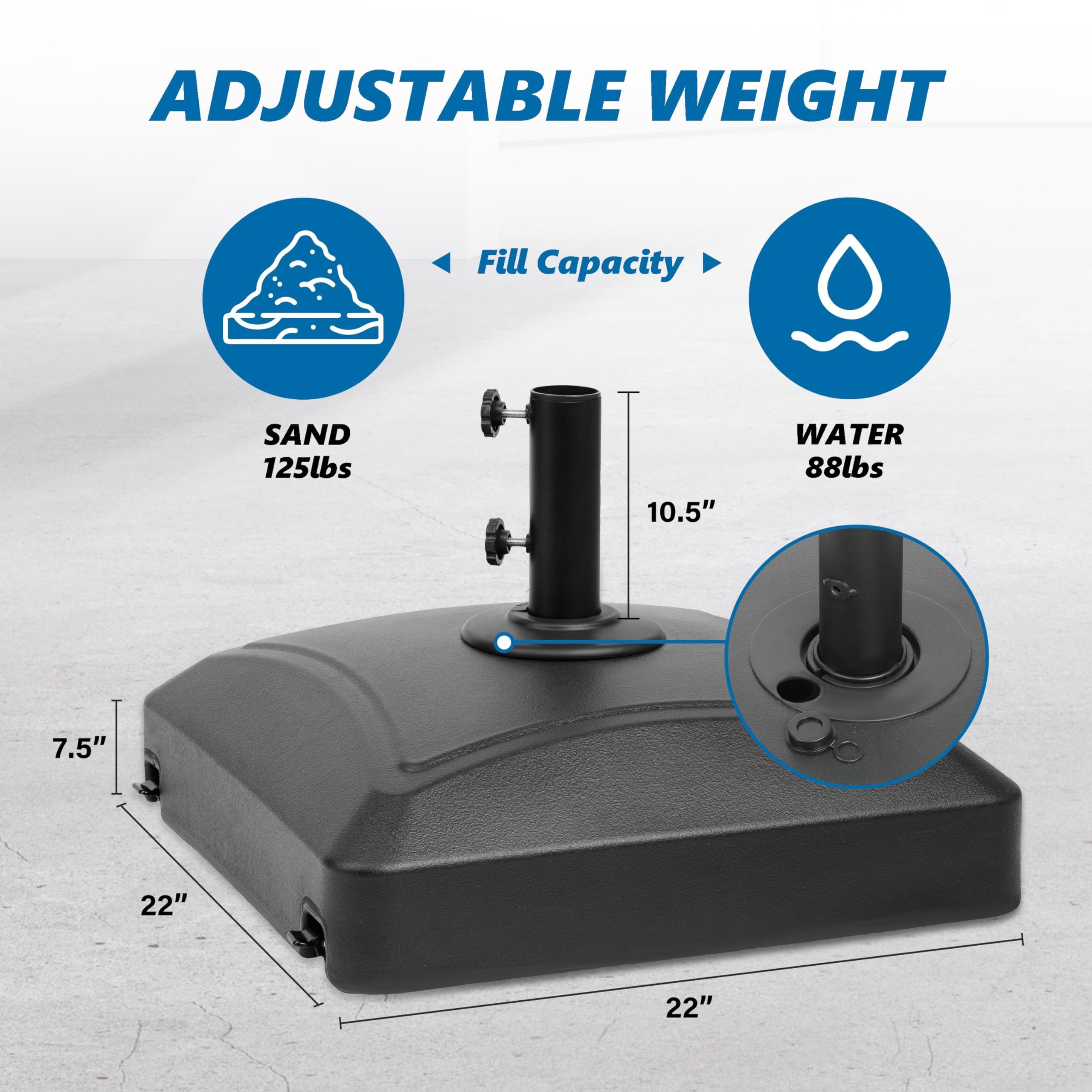 Heavy Duty: Our umbrella base can hold 125lbs of sand or 88lbs of water, which makes the umbrella base very stable and not easily be blown over by the wind. Notice: Water and sand are NOT included.
