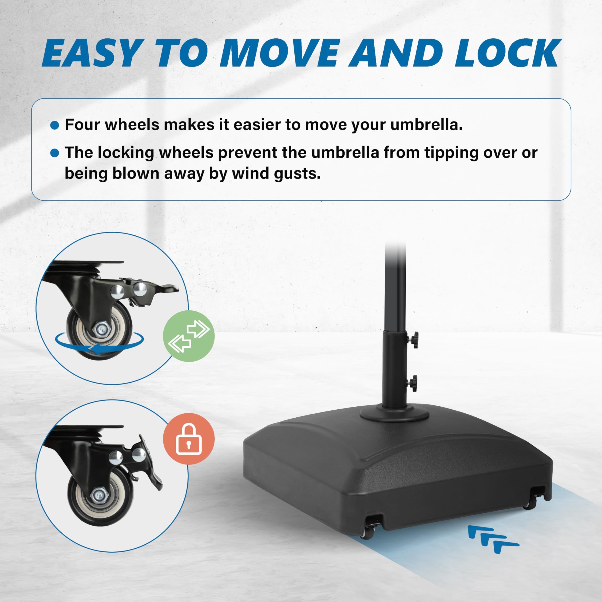 Easy Mobility: The umbrella base comes with four wheels for easy movement. While the two locking wheels prevent the umbrella from tipping over or being blown away by wind gusts.