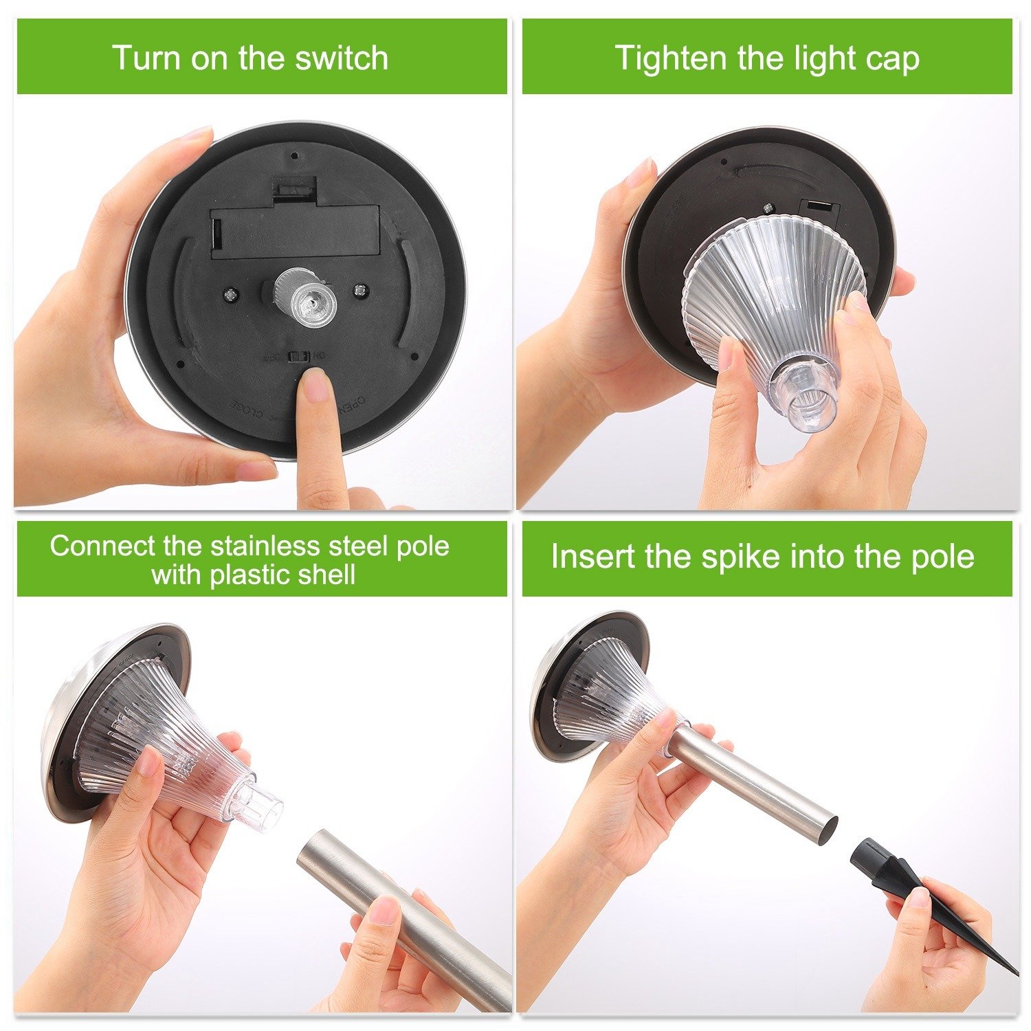 **EASY OPERATION*:Our pathway lights provide a hassle free installation that can be completed in 10 minutes or less. Turn the button in the Solar head to the 'ON' position the first time you use the lights and then place them in direct sunlight for 8Hrs to charge. The lights will automatically turn on at dusk and turn off at dawn.