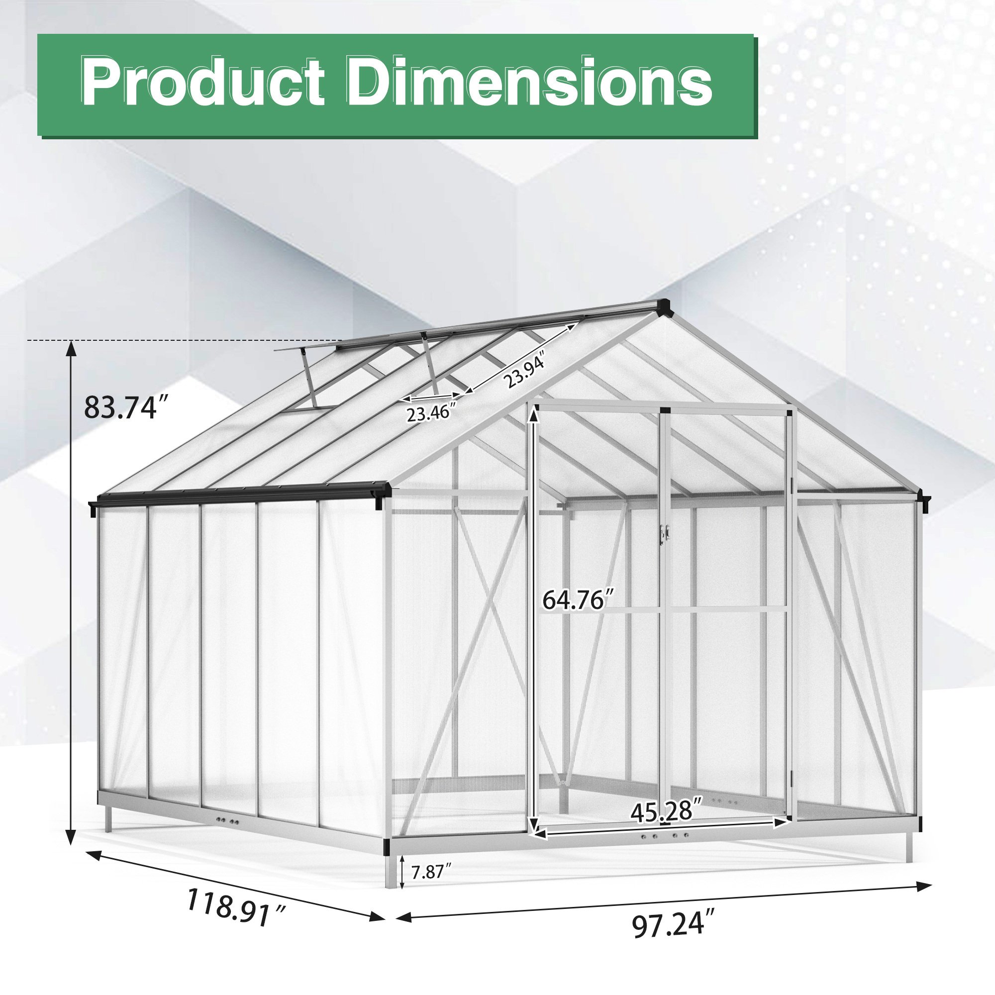 [Perfect for Plant Growing]: Measured 8' x 10', this aluminum green house for outdoors ensures your plants are protected from harmful UV rays, wind, rain and frost, while making sure the plants are getting enough light.
