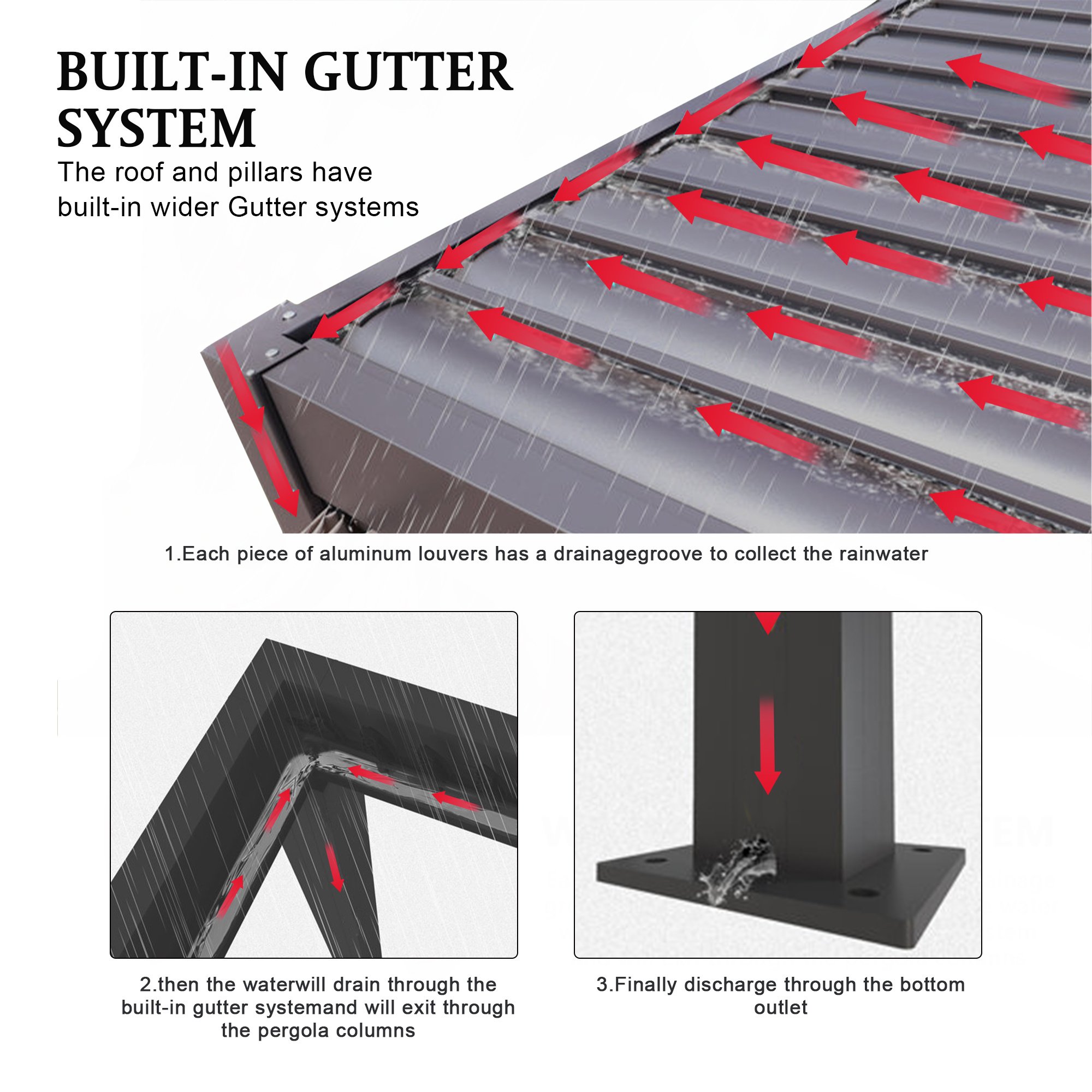 Integrated Drainage System: Rainwater will be diverted to the columns through the built-in integrated drainage system, where it will be drained through the notches in the base of the posts.
