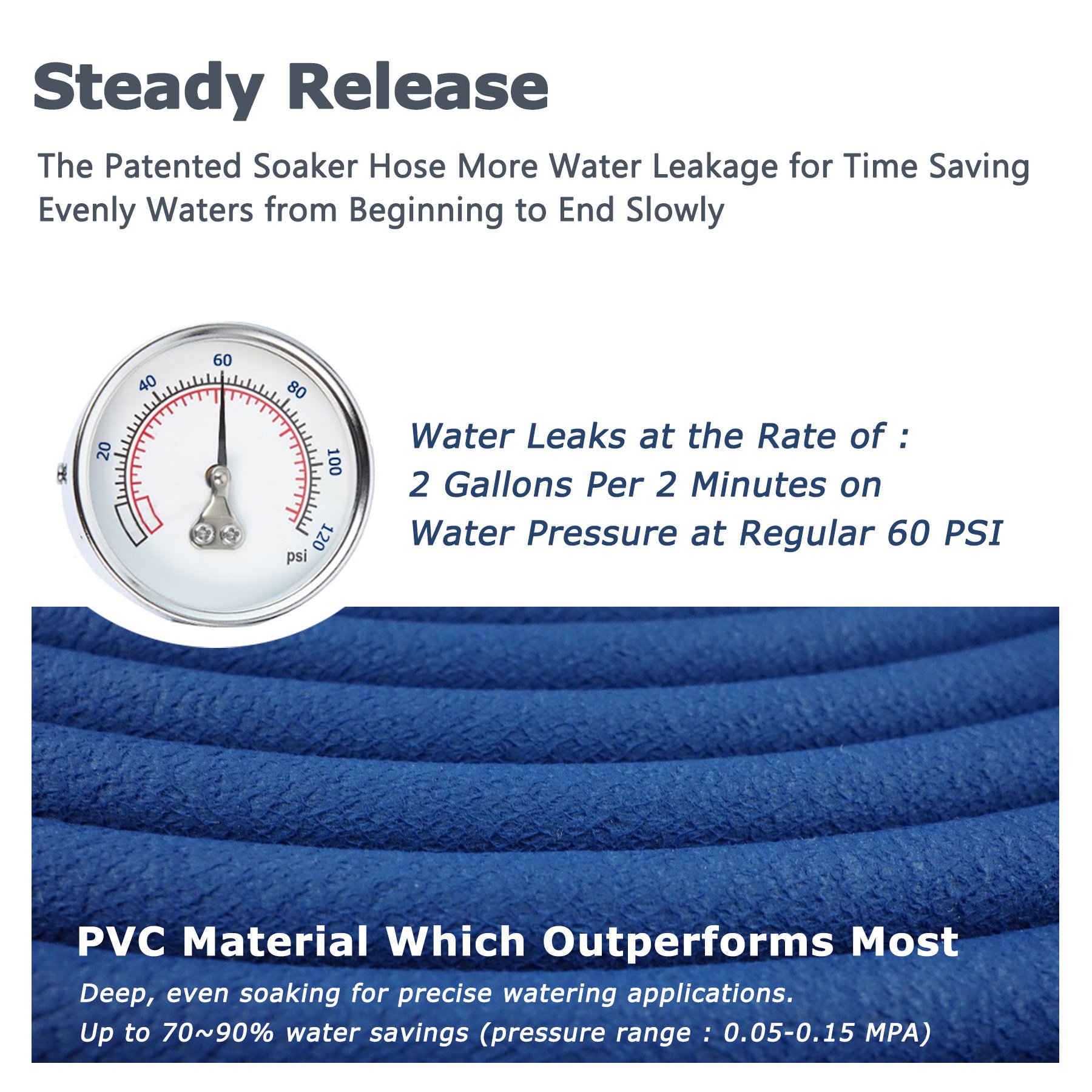 Premium Material Made:Heavy duty recycled rubber soaker hose is made to last; this rubber slow soaker hose is a handy garden tool features a unique; non clogging porous design that provides even soaking above or below ground.