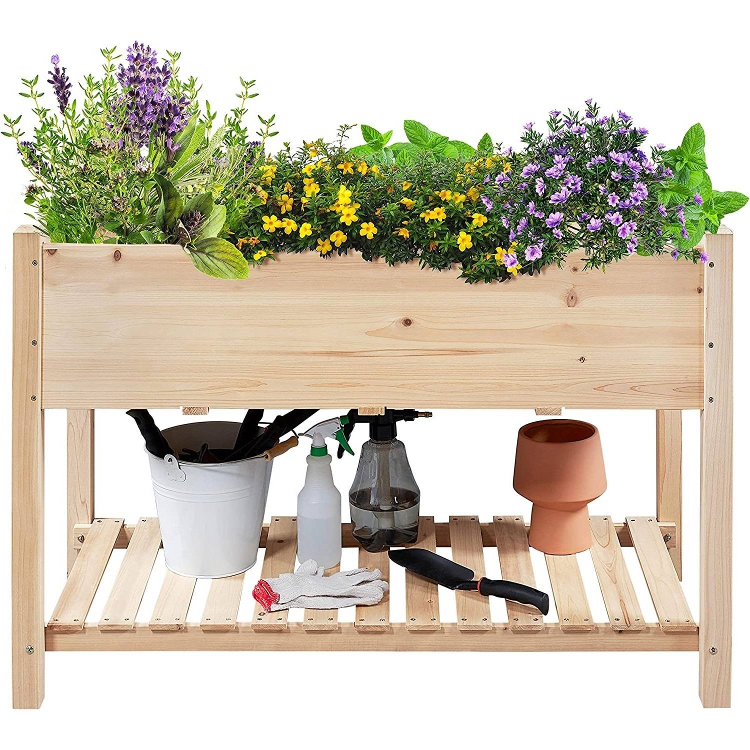 • THOUGHTFUL DESIGN: This raised planter bed has 2 tiers for planting and storing. The box is suitable for growing various plants and the lower shelf can be used for holding planting tools, small bonsai, or potted plants.