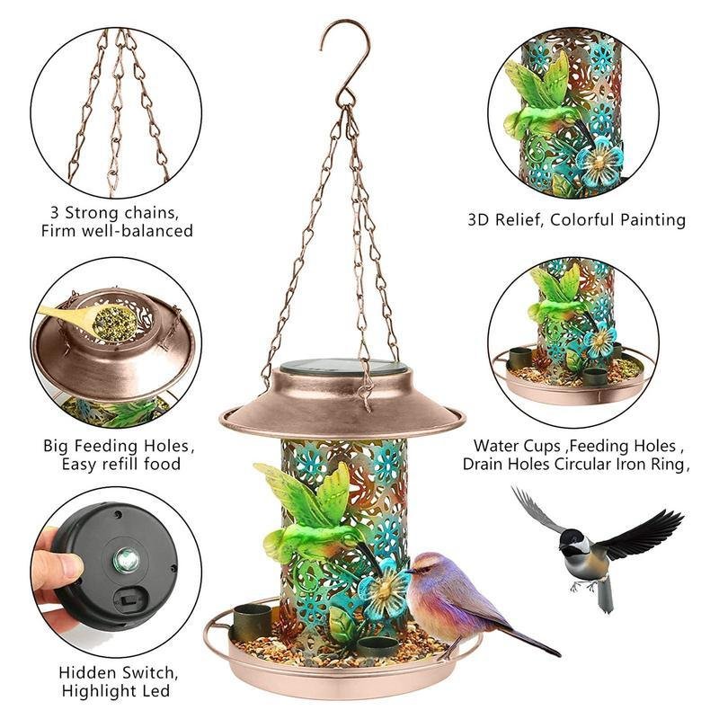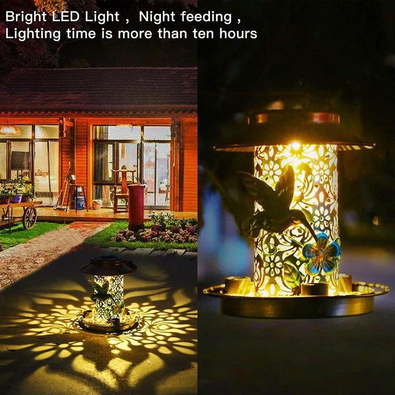 1.Beautiful Atmosphere : This solar bird feeder is not only a feeder for birds, but also a solar lantern that adds a beautiful atmosphere to your garden. The hollow pattern on the metal surface creates a great light effect at night, making your garden more charming and attractive.