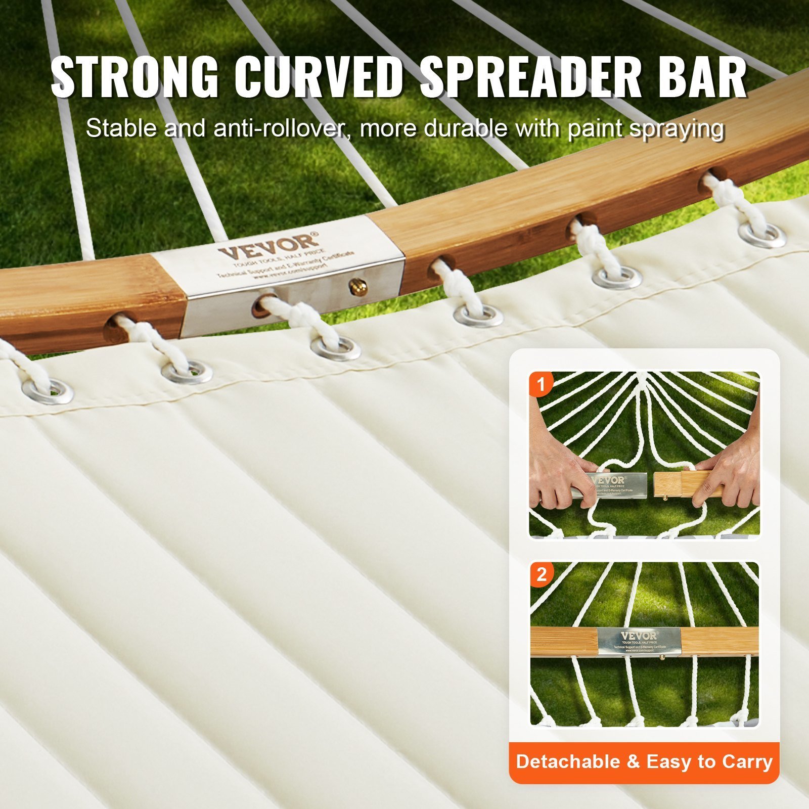 Indulge in ultimate outdoor relaxation with VEVOR's double quilted fabric hammock with stand. Crafted for lasting comfort and reliability, our hammock features 200g quilted cotton, reinforced ends, stable shaped steel stand, curved spreader bars and handwoven ropes, providing endless outdoor fun.